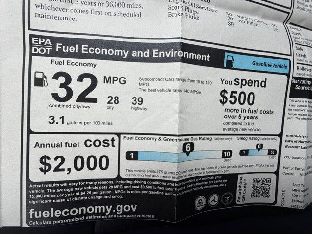 Irwin Automotive Group is proud to present you with another True Market Priced Pre-Owned Vehicle. Transparent Pricing Of $ 29031 !! This 2025 MINI Cooper S Signature Plus is loaded with the following Factory Options: Comfort Package (Comfort Access Keyless Entry), ABS brakes, Alloy wheels, Brake assist, Electronic Stability Control, Four wheel independent suspension, Front dual zone A/C, Heated door mirrors, Heated Front Seats, Heated front seats, Illuminated entry, Low tire pressure warning, Power moonroof, Remote keyless entry, Speed-sensing steering, and Traction control Comfort Package (Comfort Access Keyless Entry, Auto-Dimming Interior & Exterior Mirrors, and Auto-Dimming Rear-View Mirror), ABS brakes, Alloy wheels, Brake assist, Electronic Stability Control, Four wheel independent suspension, Front dual zone A/C, Heated door mirrors, Heated Front Seats, Heated front seats, Illuminated entry, Low tire pressure warning, Power moonroof, Remote keyless entry, Speed-sensing steering, Traction control, 4-Wheel Disc Brakes, 6 Speakers, Active Driving Assistant, Air Conditioning, AM/FM radio: SiriusXM, AM/FM Stereo, Apple CarPlay Compatibility, Auto High-beam Headlights, Auto-dimming door mirrors, Auto-dimming Rear-View mirror, Automatic temperature control, Body Color Roof, Bumpers: body-color, Classic Trim Specific Additional Content, Delay-off headlights, Driver door bin, Driver vanity mirror, Dual front impact airbags, Dual front side impact airbags, Emergency communication system: MINI Assist eCall, Exterior Parking Camera Rear, Front anti-roll bar, Front Bucket Seats, Front Center Armrest w/Storage, Front reading lights, Fully automatic headlights, Headliner In Grey, Heads-Up Display, Heated steering wheel, Knee airbag, Leather steering wheel, MINI Assist eCall, MINI Connected, MINI Navigation, MINI TeleServices, Occupant sensing airbag, Outside temperature display, Overhead airbag, Overhead console, Panic alarm, Passenger door bin, Passenger vanity mirror, Power door mirrors, Power steering, Power windows, Radio data system, Rain sensing wipers, Rear anti-roll bar, Rear window def